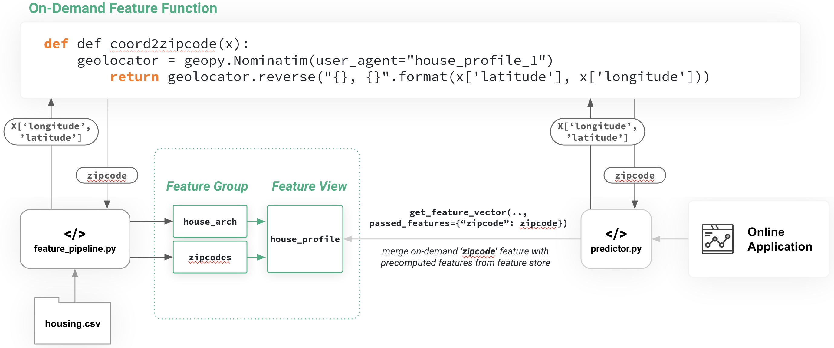 In the image below shows an example of a housing price model that demonstrates how to implement an on-demand feature, a zip code (or post code) that is computed using longitude/latitude parameters. In your online application, longitude and latitude are provided as parameters to the application, and the same python function used to calculate the zip code in the feature pipeline is used to compute the zip code in the Online Inference pipeline.