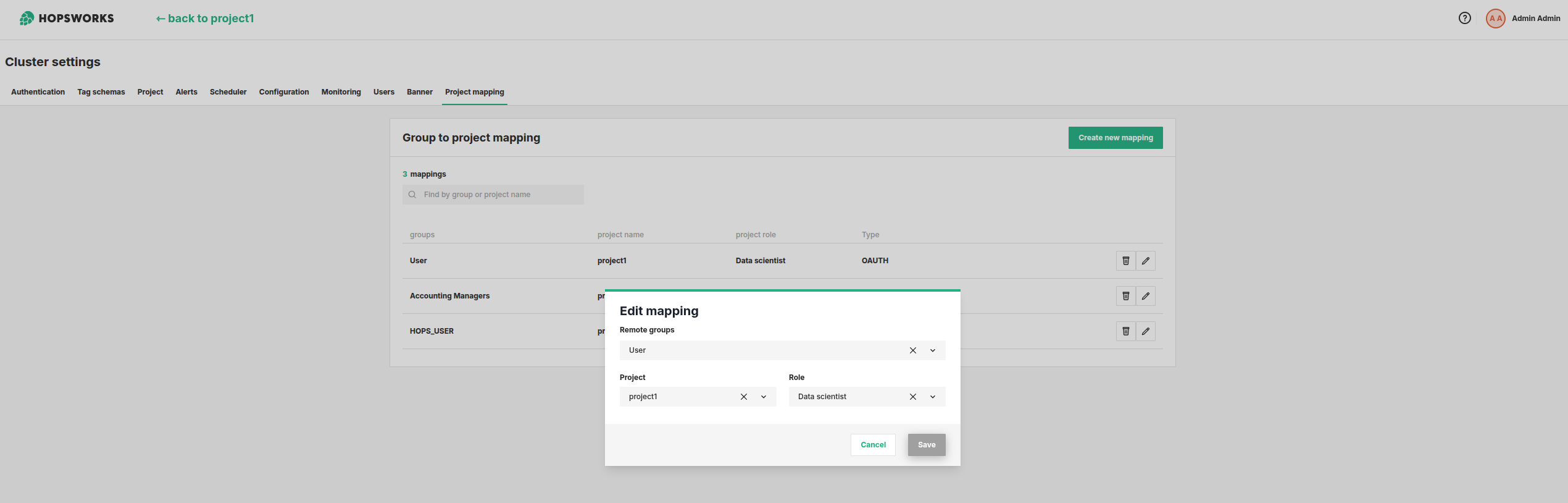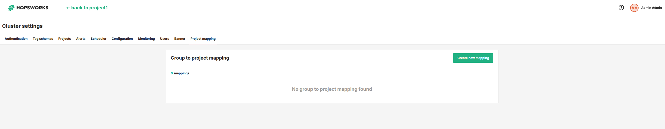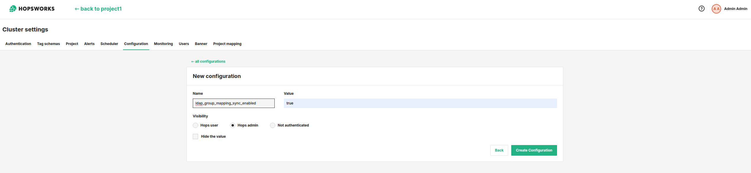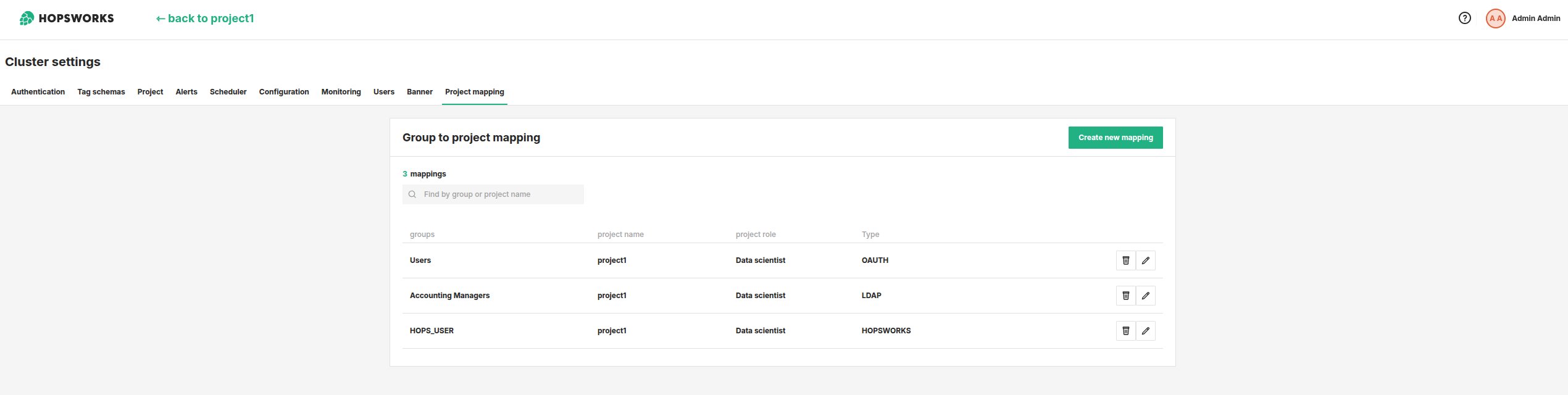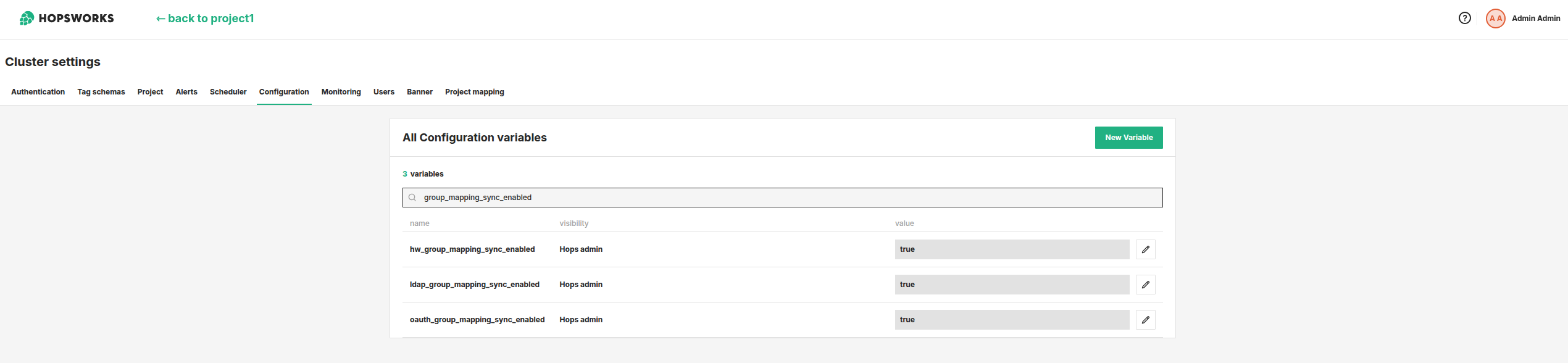 After configuring all the group mappings users will be added to or removed from the projects in the mapping when they login to Hopsworks. It is also possible to synchronize mappings without requiring users to log out. This can be done by setting ldap_group_mapping_sync_interval to an interval greater or equal to 2 minutes. If ldap_group_mapping_sync_interval is set group mapping sync will run periodically based on the interval and add or remove users from projects.