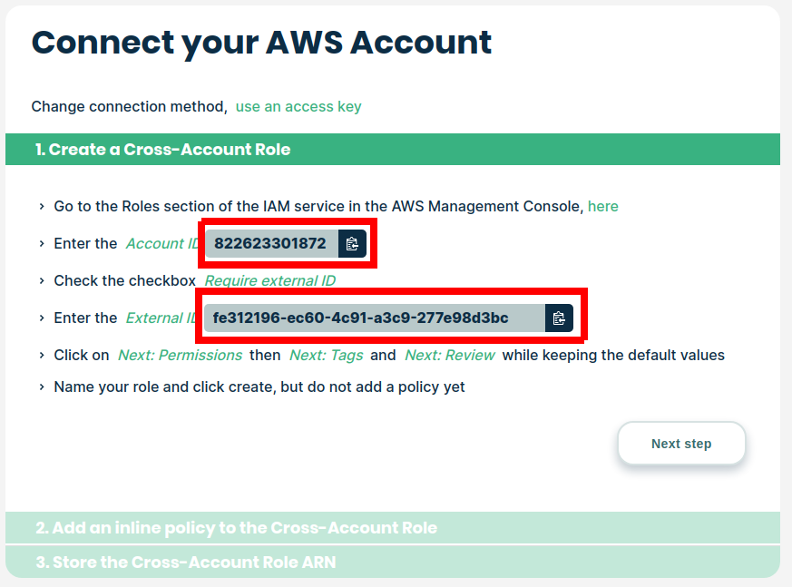 We recommend using Cross-Account Roles instead of Access Keys whenever possible, see Option 1: Using AWS Cross-Account Roles.