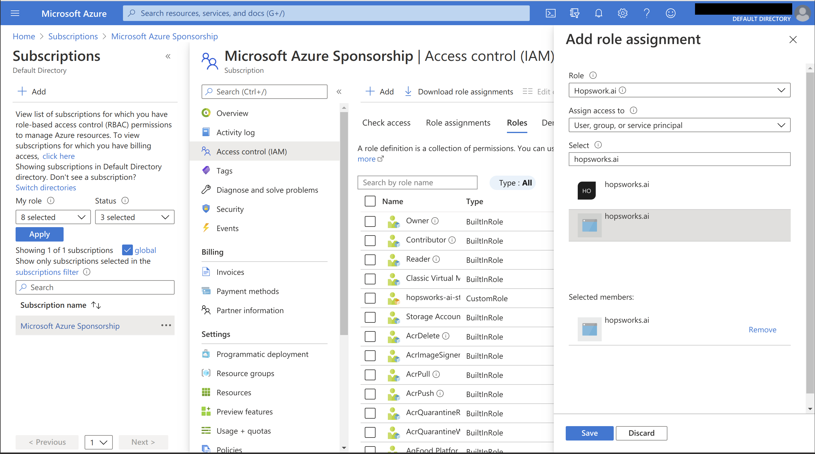 Choose the custom role you just created, select User, group, or service principal to Assign access to and select the hopsworks.ai service principal. Press Save: