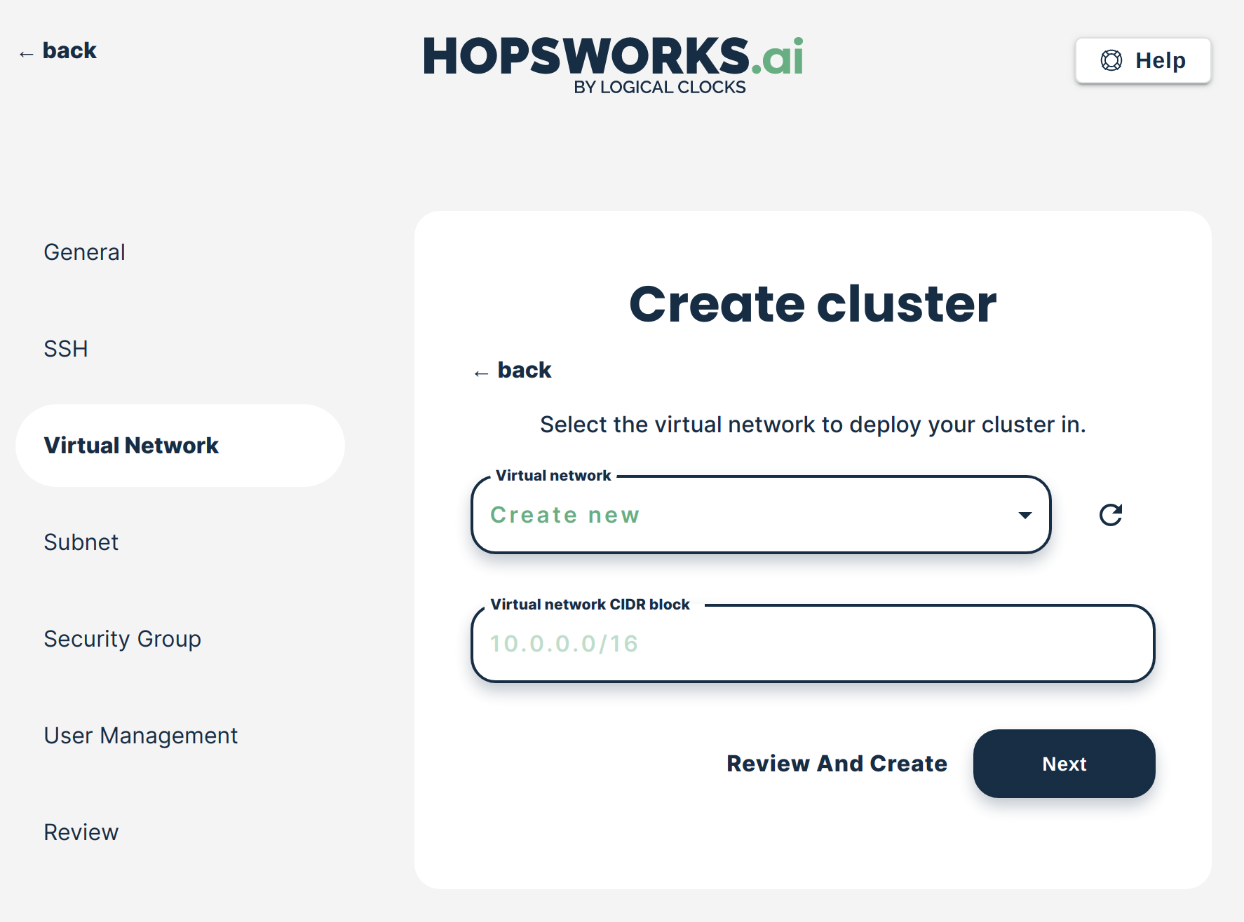 In this step, you can select the virtual network which will be used by the Hopsworks cluster. You can either select an existing virtual network or let Hopsworks.ai create one for you. If you decide to let Hopsworks.ai create the virtual network for you, you can choose the CIDR block for this virtual network. Refer to Create a virtual network and subnet for more details on how to create your own virtual network in Azure.