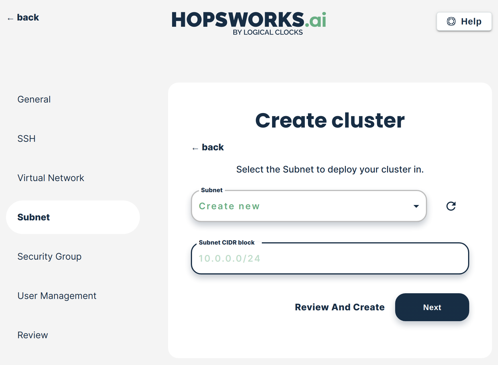 If you did not select an existing virtual network in the previous step Hopsworks.ai will create the subnet for you. You can choose the CIDR block this subnet will use.