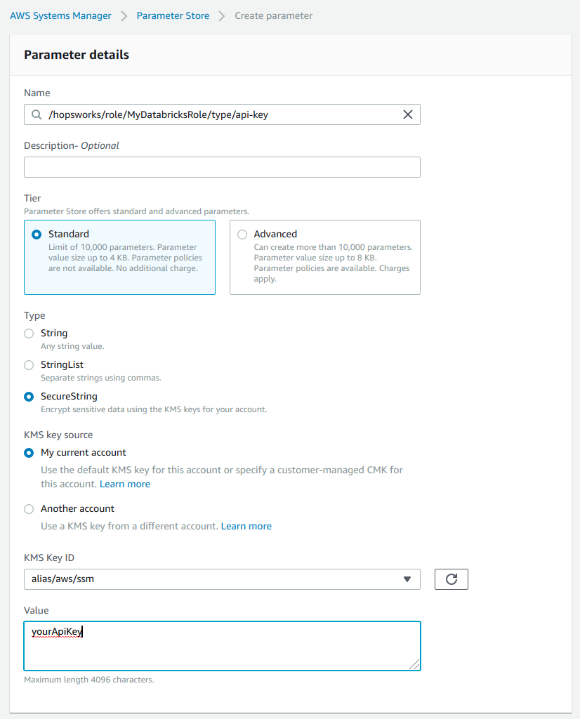 As name enter /hopsworks/role/[MY_DATABRICKS_ROLE]/type/api-key replacing [MY_DATABRICKS_ROLE] with the name of the AWS role you have created in Step 1. Select Secure String as type and create the parameter.