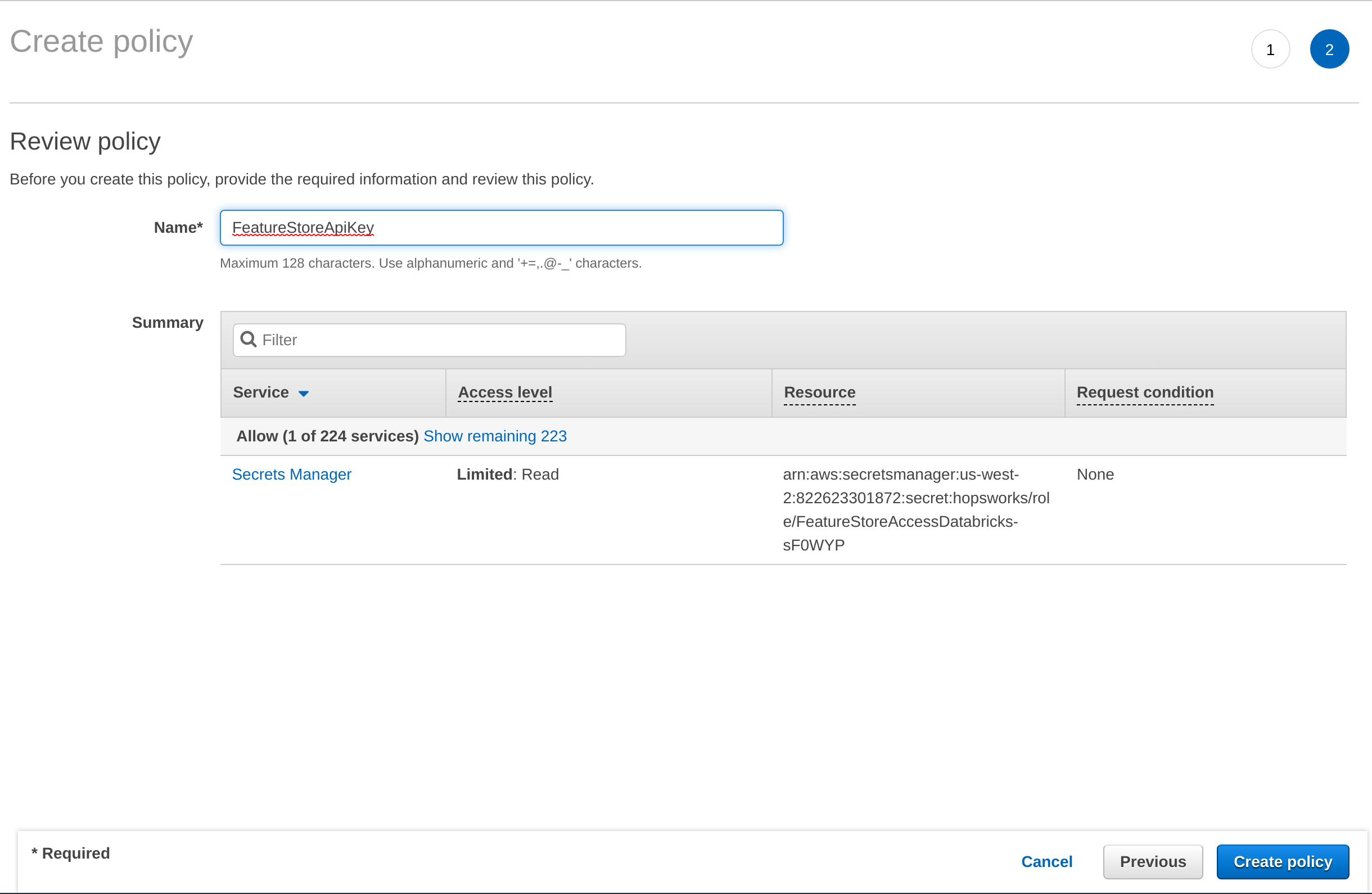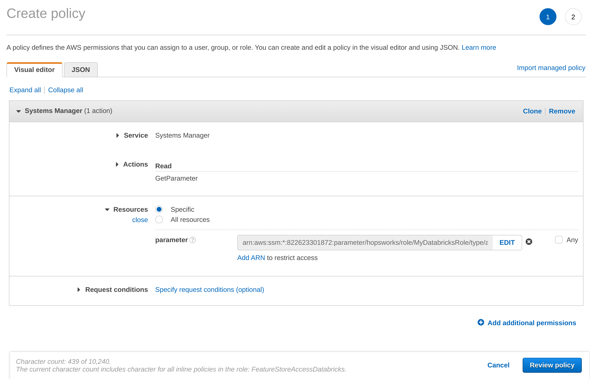 Once the API Key is stored, you need to grant access to it from the AWS role that you have created in Step 1. In the AWS Management Console, go to IAM, select Roles and then search for the role that you have created in Step 1. Select Add inline policy. Choose Systems Manager as service, expand the Read access level and check GetParameter. Expand Resources and select Add ARN. Enter the region of the Systems Manager as well as the name of the parameter WITHOUT the leading slash e.g. hopsworks/role/[MY_DATABRICKS_ROLE]/type/api-key and click Add. Click on Review, give the policy a name und click on Create policy.
