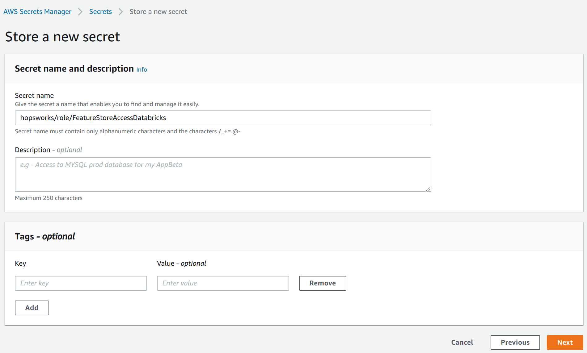 As secret name, enter hopsworks/role/[MY_DATABRICKS_ROLE] replacing [MY_DATABRICKS_ROLE] with the AWS role you have created in Step 1. Select next twice and finally store the secret. Then click on the secret in the secrets list and take note of the Secret ARN.