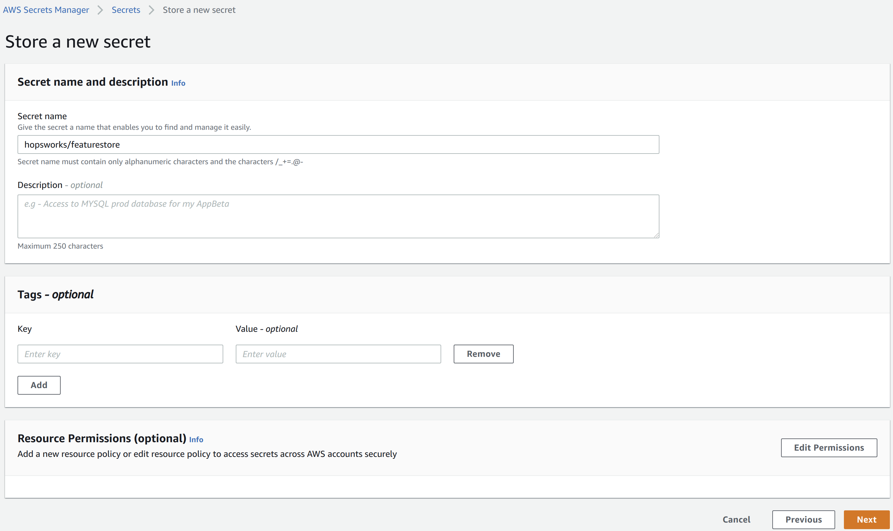 As a secret name, enter hopsworks/featurestore. Select next twice and finally store the secret. Then click on the secret in the secrets list and take note of the Secret ARN.