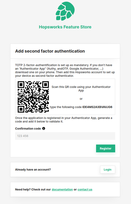 If second factor authentication is required you will be presented with a page like in the figure below. Scan the QR code or type the code in bold to register your account in your authenticator app (example. Google Authenticator).